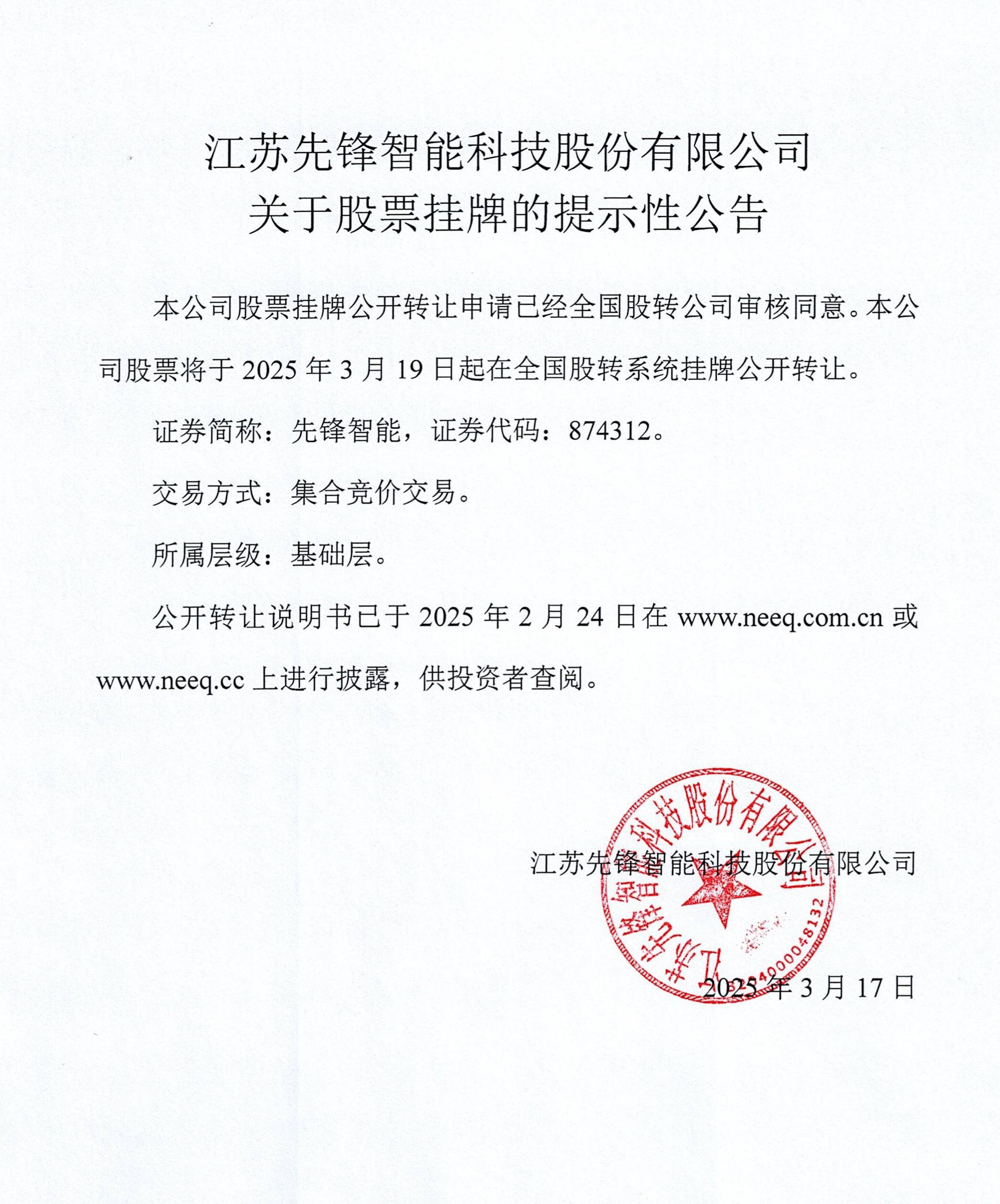 2025年03月19日,江蘇先鋒智能科技股份有限公司(證券簡(jiǎn)稱:先鋒智能,證券代碼:874312)在全國(guó)中小企業(yè)股份轉(zhuǎn)讓系統(tǒng)(新三板)鳴鑼掛牌,這座矗立于長(zhǎng)三角經(jīng)濟(jì)帶的工業(yè)智造標(biāo)桿企業(yè),在歷經(jīng)廿八載春華秋實(shí)后開(kāi)啟資本賦能新篇章。從"制造"到"智造"的躍遷之路上,始終閃耀著技術(shù)創(chuàng)新的熠熠星光。此舉既為廿載躬耕的里程碑,也是智造征途的新起點(diǎn),彰顯“中國(guó)干燥技術(shù)領(lǐng)航者”的硬核實(shí)力。